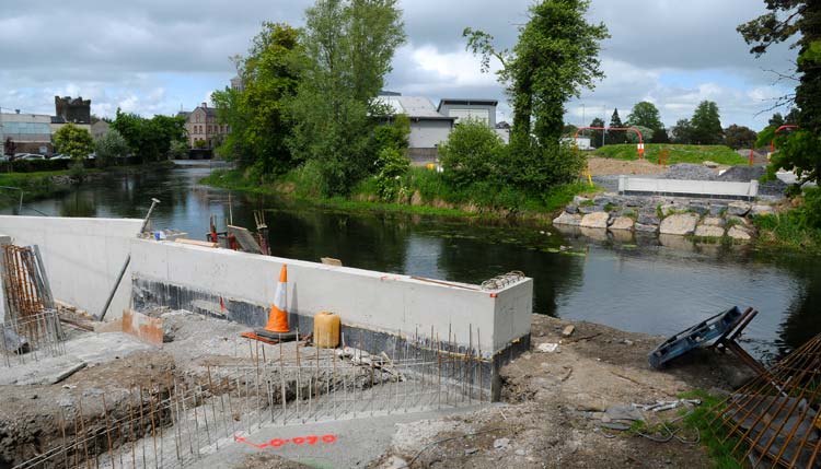 Picture shows the foundations for the well advanced pedestrian bridge, over the river Suir, joining the new and as yet unnamed Thurles town park, latter to be seen in the background.
