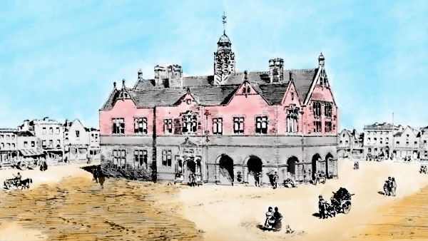 On examining the drawings provided we discover that the exterior of the Town Hall & Market House building was to be executed in local limestone to the level only of the first floor. Above that level it was proposed to use red brick with cut stone dressings also of local limestone. In addition to the perspective view, two plans of the building were published showing the suggested interior arrangement.