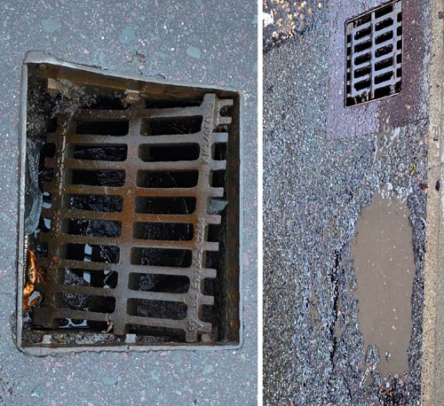 Pic 1 Left: Grate cover dislodged. Pic 2 Right: On Barry’s Bridge, once again, a sinking surface, as 18 wheelers bounce over a raised pedestrian platform. Pictures: G.Willoughby.