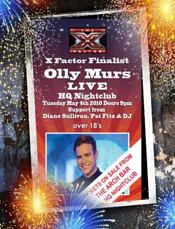 Tonight about 30 minutes ago, the HQ Nightclub web site ( www.nightclubhq.com ) officially confirmed that Olly Murs will be performing live at their venue here in Thurles on May 4th, 2010, with support from Diane Sullivan and Pat Fitz.
