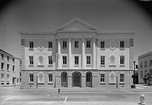 President George Washington (1732 to 1799) greatly admired Hoban’s work on his Southern Tour, and may have met with James in Charleston in May 1791. He later summoned the architect to Philadelphia, Pennsylvania, the then temporary National Capital in June 1792. The following month Hoban was named winner of the design competition for The White House. His initial design seems to have had a 3-story facade, 9 bay windows across, similar to the Charleston courthouse, which Hoban had completed previously. Under Washington’s influence, Hoban amended this to a 2-story facade with 11 bay windows across and, at Washington’s insistence, the whole presidential mansion was faced with stone. James Hoban later won a gold medal for his practical and handsome design.