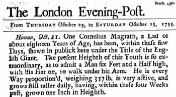 In an English issue of the then “Daily Advertiser” newspaper dated January 31st 1753, his sponsors ran the following notice: “Just arrived in this city, from Ireland, the youth, mentioned lately in the newspapers, as the most extraordinary production in nature. He is allowed by the nobility and gentry, who daily resort to see him, to have the most stupendous and gigantic form (although a boy), and is the only representation in the world of the ancient and magnificent giants of that kingdom. He is seven feet three inches in height, without shoes. His wrist measures a quarter of a yard and an inch. He greatly surpasses Cajanus the Swede, in the just proportions of his limbs; and is the truest and best proportioned figure ever seen. He was sixteen years of age the 10th of last March and is to be seen at the ‘Peacock,’ at Charing Cross, from eight in the morning, till ten at night.”