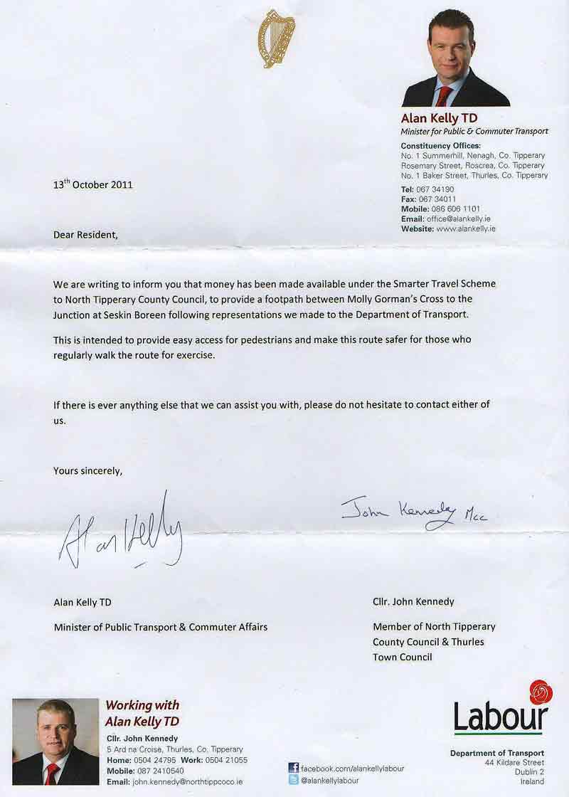 See a letter recently posted to households resident between Molly Gorman’s Cross and Seskin Boreen, from Mr Alan Kelly, TD. (Click on letter, top left, to see full resolution image.)