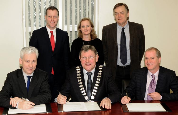 On Monday morning last saw the formal signing of the contract for the new Thurles town park. Amongst those in attendance for the signing were Mr Joe MacGrath ( Chief Executive Tipperary County Council), Mr Michael Ryan (Thurles Administrator), Mr Michael Fitzgerald, (Cathaoirleach Tipperary County Council), Mr Pearse Ferguson (SIAC Construction Ltd.,) Mr Nicholas de Jong (Park Design Team), M/s Deirdre O’Shea (Council Administrative Staff Member), Tipperary Co Councillors; Mr Michael Smith, Mr John Hogan, Mr Jackie Cahill, Mr Seamus Hanafin, Mr Micheál Lowry, Mr David Doran and Mr Jim Ryan together with Mr Padraig Killeen, (SIAC Construction Ltd.), Mr Michael Tierney, Mr Matt Shortt (District Director for Templemore / Thurles Municipal Council) and Mr Ruairi Boland (Engineer).