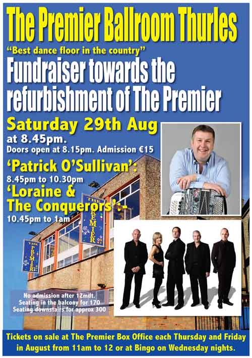 A dance to raise funds towards the refurbishment of The Premier Hall, here in Thurles, will take place in The Premier Hall on the Saturday night of August 29th next.