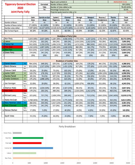 While 100% of ballot boxes have now been tallied and keeping in mind that the above count is a rough tally and NOT the official count; hereunder appears to be the political layout for the lifetime of the next Dáil with regards to Co. Tipperary.