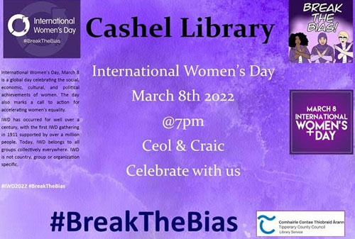 Ms Maura Barrett, (Branch Librarian in Cashel Library) and co-ordinator of this event, says it kick starts a number of #BreakTheBias themed events that the library will host in 2022 with schools, community groups and patrons.