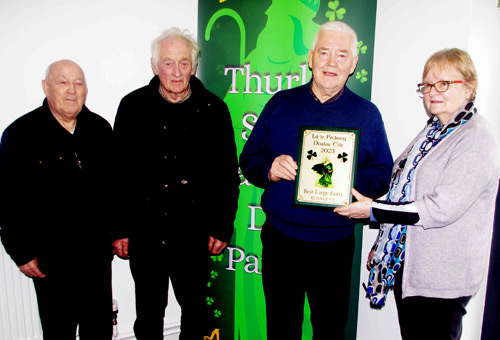 Mrs Anne Kennedy presenting the ‘Runner Up Small Float Award’, to Mr Tim Quinn & Colleagues, representing Mens Shed Thurles, following the Thurles St. Patrick’s Day Parade 2023.