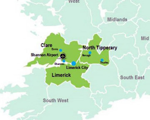 The Mid-West region consists of counties Tipperary North, Clare and Limerick; spanning 10,511 km2, or 14.95% of the total area of the Irish State, serving a population of some 506,000 inhabitants.
