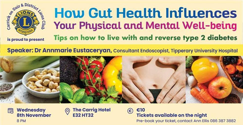 Persons, including those who suffer from Type 2 diabetes, will be interested to note that Carrick on Suir & District Lions Club are holding an information evening entitled “How Gut Influences your Physical and Mental Well-being”