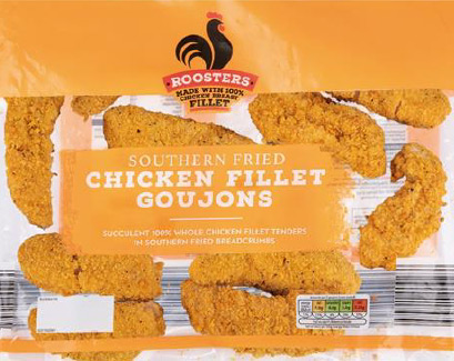 Product Identification: Roosters Southern Fried Chicken Fillet Goujons (frozen); pack size: 800g.