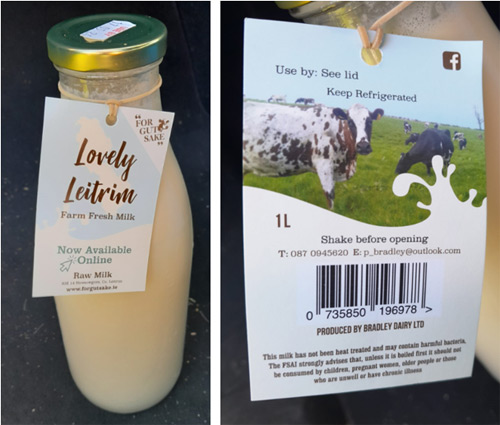 Product Identification: For Gut Sake Lovely Leitrim Farm Fresh Raw Milk; pack size: 1 litre.