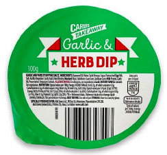 Product Identification: Carlos Takeaway Garlic & Herb Dip; pack size: 100g