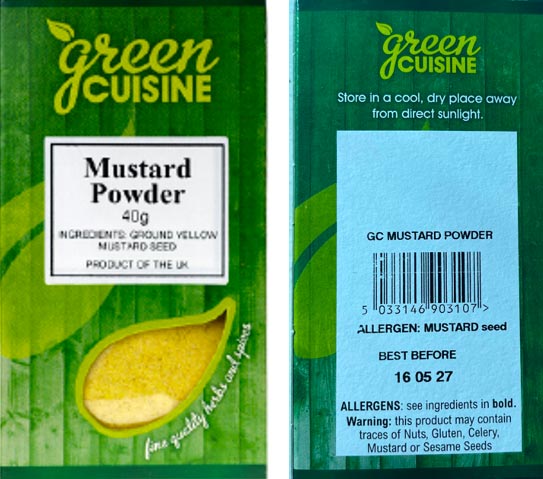 Product Identification: Green Cuisine Mustard Powder; pack size: 40g