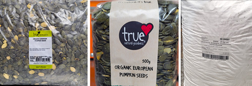 Product Identification: True Natural Goodness Organic Pumpkin Seeds European pack sizes: 2.5kg and 500g; and Organic Pumpkin Seeds European; pack sizes: 25kg