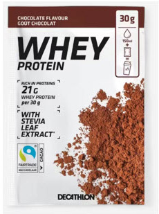 Product Identification: Decathlon Chocolate Flavour Whey Protein; pack size: 30g