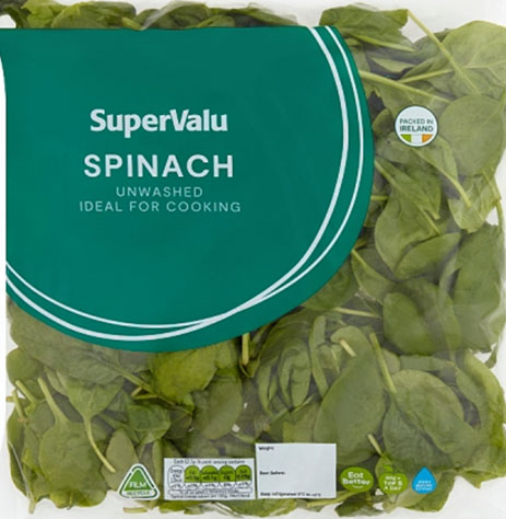 Product Identification: SuperValu Spinach bag (Unwashed); pack size 250g.