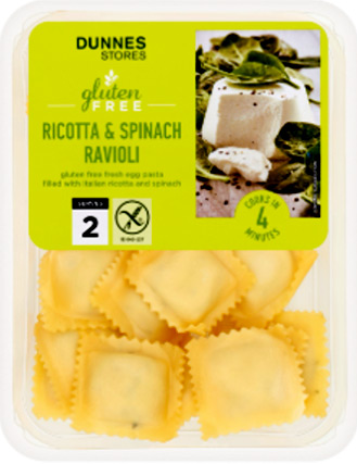 Product Identification: Dunnes Stores gluten free Ricotta & Spinach Ravioli; pack size: 250g.