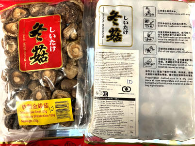 Product Identification: Dried Shiitake Small Mushrooms; pack size: 100g.