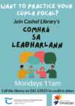 Bain triail as do chúpla focal sa leabharlann Chaiseal Mumhan. Tá fáilte roimh gach duine.[Try your hand at a few words in the Cashel Munster library. Everyone is welcome.]