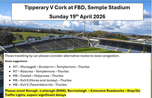 An Garda Síochána Tipperary are asking those wishing to attend the Tipperary V Cork match on Sunday next April 19th, to please be aware that there is roadworks around the Semple Stadium, Thurles, which may affect your journey time. Please see image hereunder.