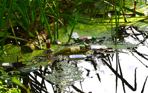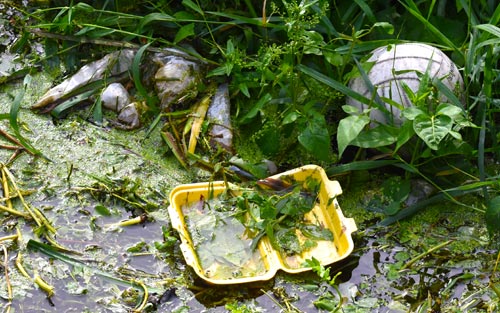 Just a small sample of the discarded litter at Barry’s Bridge, in River Suir, Thurles Town centre. Pic: G. Willoughby. (Image taken Sept. 29th 2025)