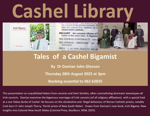 Ms Maura Barrett, (Cashel Library) Reports: An exciting lecture on a Cashel Bigamist, from the early 1800’s, will take place in Cashel Library on Thursday 28th August at 2:30pm.