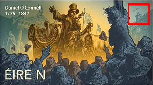 The background to the left-hand-side of one of these two new stamps, directly behind O’Connell, shows the front of the General Post Office, (O’Connell Street, Dublin), while the background on the right-hand-side (See image framed in red hereunder) depicts a building with a chimney which displays an old style television aerial.