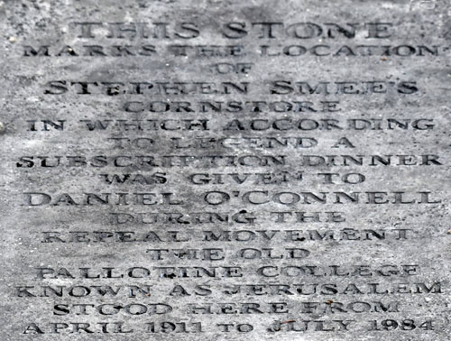 It reads: “This stone marks the location of Stephen Smee’s Corn-store in which, according to legend, a subscription dinner was given to Daniel O’Connell during the Repeal Movement. The Old Pallottine College, known as “Jerusalem” (later) stood here from April 1911 to July 1984.”