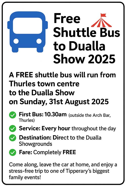 A FREE shuttle bus will run from Thurles town centre to the Dualla Show, Cashel Co. Tipperary, on Sunday next, August 31st 2025.