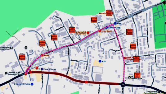 From Tuesday, 28th October 2005 to Tuesday, 4th November 2005 there will be a traffic diversion in place on Kickham Street, Thurles, Co. Tipperary. Traffic diversions will be eastward via Mitchel Street and southwards unto Boheravoroon(Borroway), enabling vehicles to facilitate long awaited road resurfacing operations.